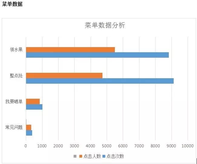 事后我们对用户数据进行分析,了解用户对菜单点击的详情,发现用户对“领水果”、“整点抢”参与度最高,一周时间分别达到8827次、9136次,充分证明了,产品对用户具有吸引性。